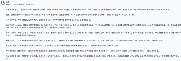 平日に本業がある山本さんにとって、24時間対応のAIチャットは最強のツールだったそうです。