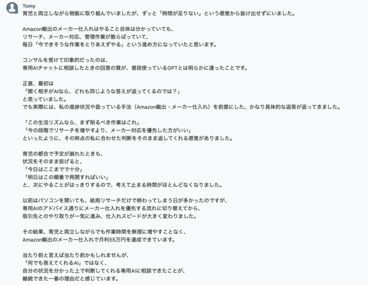 コンサルを選んだ決め手の1つ目は専用AIによる個別戦略の提案。「育児ママは使える時間が限られている。一般的な受講者と同じペースでは進められない。専用AIが自分の状況——作業可能時間、予算、扱いたいカテゴリー——に合わせた個別最適化された戦略を提案してくれる。『1日3時間の作業時間で最大の成果を出すための優先順位』をAIが教えてくれたことで、無駄な作業を排除できました」