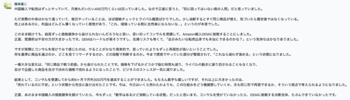 「中国輸入時代は毎朝起きるとまずカートボックスの状況を確認するのが日課でした。他のセラーに取られていないか、値下げされていないか。その恐怖から解放されただけでも、OEMに転向した価値があります。今は自分の商品ページを自分だけがコントロールできる。価格も、商品画像も、商品説明も、全て自分の判断で決められる。この自由は中国輸入転売では絶対に手に入りません」